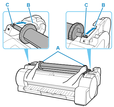 롤 용지를 로드할 때 슬라이드 가이드(B)와 롤 홀더 샤프트(C) 사이에 손가락이 끼지 않도록 주의하십시오.