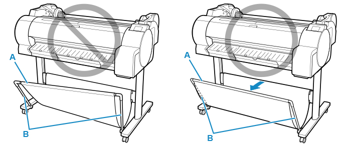 인쇄된 문서를 바스켓에 저장하려면 먼저 앞쪽 로드(A)가 기울어지지 않도록 측면 로드(B)를 똑같이 당겨 내린 다음 바스켓을 사용하십시오.