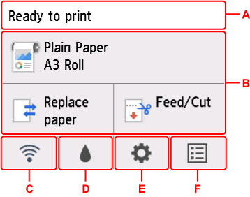 - 로드된 용지에 대한 정보가 상단 영역에 표시됩니다. 이 옵션을 탭하면 용지 관련 메뉴가 표시되고 용지 설정이 가능합니다. 메뉴에서 자주 사용되는 용지 교체(Replace paper) 및 용지공급/절단(Feed/Cut)이 하단 영역에 나타나며 직접 선택할 수 있습니다.