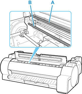 선형 눈금자(A) 또는 캐리지 샤프트(B)를 만지지 마십시오. 이 부분을 만지면 고장 날 수 있습니다.