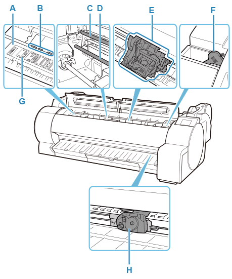 - プリントヘッドを動かします。印刷するための重要な部品です。(「キャリッジ」参照)