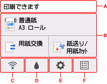セットされている用紙の情報が上段に表示されます。この項目をタップすると、用紙に関するメニューが表示され、用紙の設定などを行えます。メニューの中でよく使用する[用紙交換]と[紙送り/用紙カット]は、下段に表示されており、直接選ぶことができます。