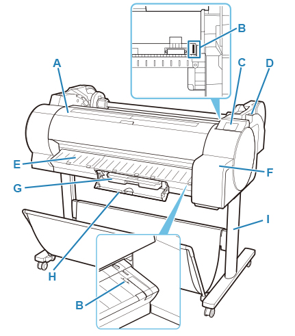 - 프린터를 잡아주는 스탠드입니다. 캐스터가 장착되어 있어 간편하게 이동할 수 있습니다. ("스탠드"를 참조하십시오.)