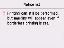 장시간 많은 양의 테두리 없는 인쇄를 수행하면 경고 메시지가 나타나고 테두리 없는 인쇄의 확장량(Extension for borderless printing)의 설정을 지정할 수 없게 됩니다.