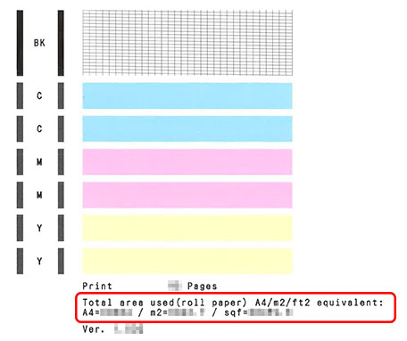 La zone totale de papier rouleau utilisé est imprimée sur le motif de vérification des buses.