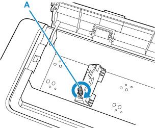 3. Gire el tornillo moleteado (A) en el sentido de las agujas del reloj para fijar el apoyo del soporte del rollo a la impresora.