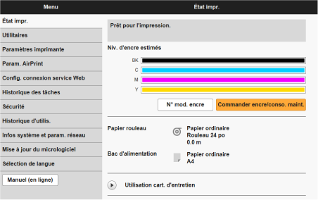 Cette fonction affiche des informations sur l'imprimante, telles que la quantité d'encre restante, l'état de la machine et des informations détaillées sur les erreurs.
