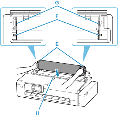 左右のロールホルダー(E)を持って、ロールホルダーの軸(F)が、ロールホルダースロット(G)の手前に来るように、ロール紙をスライドガイド(H)上に載せる