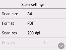 Quando viene visualizzata la schermata di standby della scansione, selezionare Imp. scans. (Scan settings) per selezionare l'elemento di impostazione. Scorrere per visualizzare le voci di impostazione e selezionare la voce per visualizzare le impostazioni. Selezionare per specificare l'impostazione.