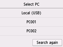 Для компьютера с USB-соединением выберите Локально (USB) (Local (USB)), а если вы хотите сохранить отсканированные данные на компьютер с сетевым соединением, выберите нужный компьютер.