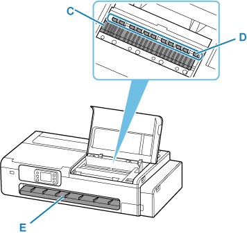 プラテン(C)、用紙押さえ(D)、排紙ガイド(E)などのインクの汚れや紙粉(カット屑など)をふき取ります。