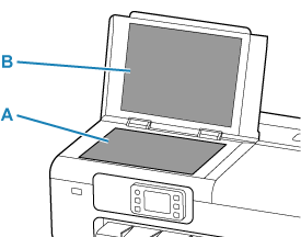 原稿台のガラス面(A)と、原稿台カバー裏側にあるガラス面と触れる部分(B)の汚れやほこりをやさしくふき取ります。