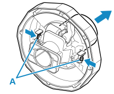 Zum Entfernen der 3-Zoll-Papierspulenaufhängung drücken Sie die Laschen (A) nach innen und entfernen Sie die Befestigung.