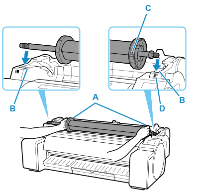 5. 롤 홀더 플랜지(A)를 잡고 홀더를 롤 용지 홀더 슬롯에 로드할 때 수평을 유지하면서 양쪽 끝의 슬라이드 가이드(B)를 따라 홀더를 놓습니다.