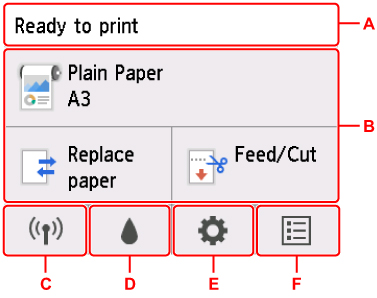 - 로드된 용지에 대한 정보가 상단 영역에 표시됩니다. 이 옵션을 탭하면 용지 관련 메뉴가 표시되고 용지 설정이 가능합니다. 메뉴에서 자주 사용되는 용지 교체(Replace paper) 및 용지공급/절단(Feed/Cut)이 하단 영역에 나타나며 직접 선택할 수 있습니다.