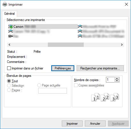 L'aspect de la boîte de dialogue dépend du logiciel de l'application. Dans la plupart des cas, la boîte de dialogue propose les options d'impression de base et vous permet de choisir l'imprimante, d'indiquer l'étendue de pages, le nombre de copies, etc.