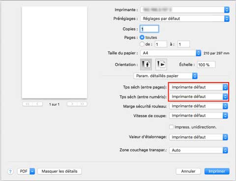 Lorsque vous utilisez du papier sur lequel l'encre met plus longtemps à adhérer, il est possible que de l'encre soit transférée sur la surface du papier pendant l'éjection et le salisse. Dans ce cas, vous pouvez améliorer cette situation en réglant la durée d'attente de séchage de l'encre après l'impression.