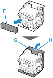Important- Transportez toujours la tête d'impression en tenant les poignées droite et gauche. Ne touchez jamais la buse (I) ou les contacts métalliques (J). Cela pourrait endommager la tête d'impression et affecter la qualité d'impression.
