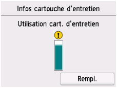 La cartouche d'entretien absorbe l'excès d'encre issu de l'impression sans bordure et du nettoyage de la tête d'impression. Vous pouvez connaître la capacité restante de la cartouche d'entretien en consultant l'écran tactile.