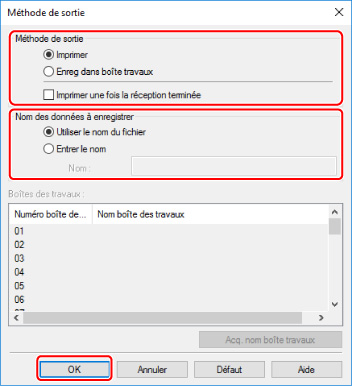 Si vous sélectionnez Enreg dans boîte travaux, sélectionnez le numéro de boîte des travaux dans N° boîte de travaux.