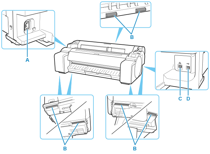 - Per il trasporto della stampante, prevedere l'intervento di tre o più persone, utilizzando le maniglie presenti su entrambi i lati. Inoltre, tenere strette la parte destra e sinistra di queste parti quando si sposta la stampante con un supporto.