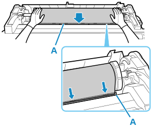 롤 홀더 플랜지(A)를 잡고 홀더를 롤 용지 홀더 슬롯에 로드할 때 수평을 유지하면서 양쪽 끝의 슬라이드 가이드(B)를 따라 홀더를 놓습니다.