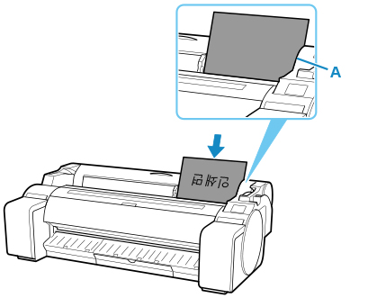 용지 한 장을 인쇄면이 위로 향하도록 하고 오른쪽 가장자리를 롤 용지 커버의 오른쪽에 있는 용지 맞춤선(A)에 맞춰 용지 공급 슬롯에 로드합니다.