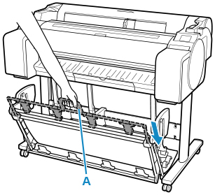 24in 또는 A1(세로) 롤 용지를 사용하는 경우 조절 가능 스토퍼(A)를 잡아당깁니다.
