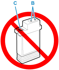 No toque nunca los orificios de tinta (B) ni los contactos metálicos (C). Esto podría provocar manchas, dañar el depósito de tinta y afectar a la calidad de impresión.