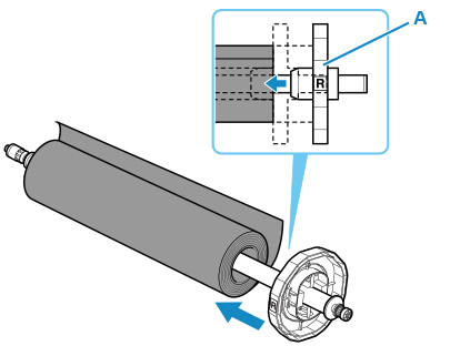 3. 그림과 같이 롤 용지의 앞 가장자리가 앞으로 향하도록 하여 롤 용지의 오른쪽에서 롤 홀더를 삽입합니다. 롤 용지가 롤 홀더의 플랜지(A)에 닿을 때까지 확실하게 삽입합니다.