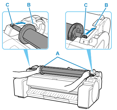 롤 용지를 로드할 때 슬라이드 가이드(B)와 롤 홀더 샤프트(C) 사이에 손가락이 끼지 않도록 주의하십시오.