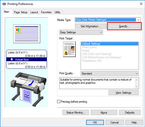 Selezionare la scheda Principale e fare clic su Specifica... per Tipo carta.