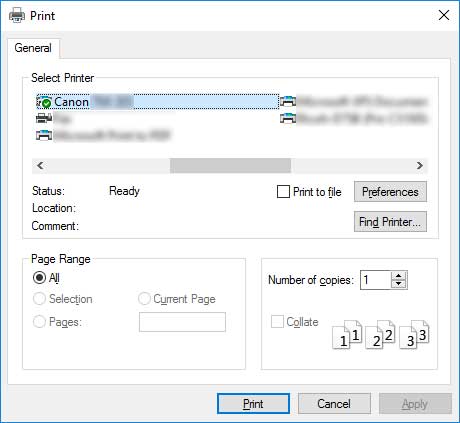 원본 어플리케이션의 파일(File) 메뉴에서 인쇄(Print)를 선택하면 인쇄 조건을 설정하는 대화 상자가 표시됩니다.