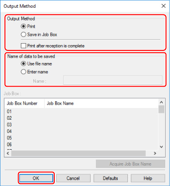 참고- 작업 상자 이름 가져오기(Acquire Job Box Name)를 선택하면 프린터에서 가져온 개인 작업 상자 이름이 작업 상자(Job Box) 목록에 표시됩니다.