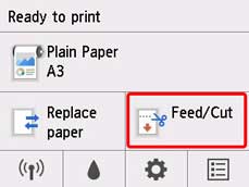 Toque na área de exibição de configurações de papel >Alimentar/cortar (Feed/cut)>Cortar papel (Cut paper)>Sim (Yes)