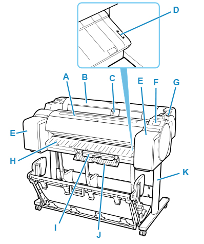 - 打印机的安装支架。 带有脚轮,便于移动。 (请参见“支架”。)