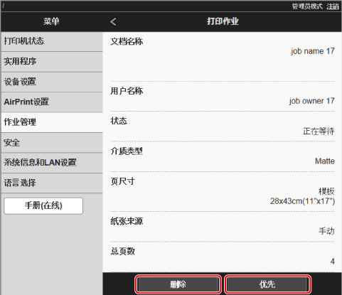 打印机正在处理的打印作业统称为作业队列。 可以根据需要删除或抢占作业队列中的作业。