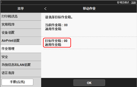 如下所示,可以将存储在打印机硬盘内的打印作业(已保存作业)从当前作业箱移动到其他作业箱。