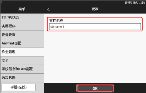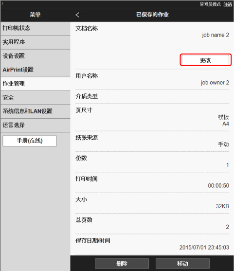 如下所示,可以重新命名打印机硬盘中存储的打印作业(已保存作业)。