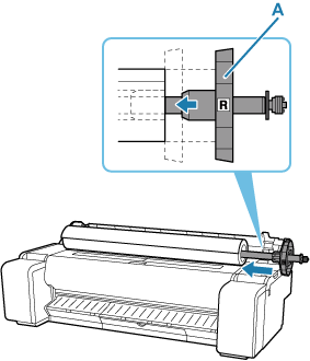 Setzen Sie mit nach vorne zeigender Vorderkante des Rollenpapiers den Rollenhalter an der rechten Seite in die Rolle ein. Setzen Sie die Rolle fest ein, bis das Rollenpapier den Flansch (A) des Rollenhalters berührt.