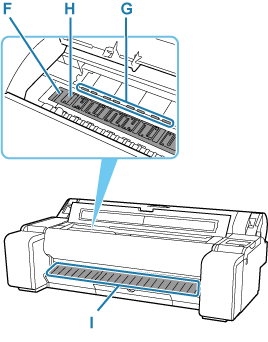 Entfernen Sie mögliche Tintenreste und Papierstaub (Schnipsel vom Schneiden) von der gesamten Walze (F), der Papierhaltevorrichtung (G), den Auffangnuten der Tinte (H), der Ausgabeführung (I) usw.