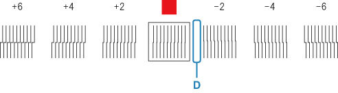 Beispiel 2: Bewegen Sie den Winkeleinstellhebel an eine Position zwischen den Zahlen (oder zwischen der Zahl und dem Quadrat (D)) der beiden Zusammenstellungen von Linien mit den geringsten Ausrichtungsfehlern. Wählen Sie in diesem Fall -1.