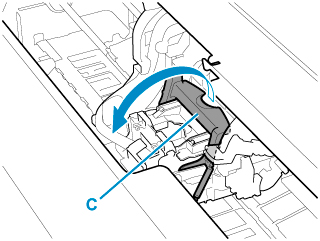 Mientras sostiene la parte central (C) de la palanca de bloqueo del cabezal de impresión, bájela hacia atrás.