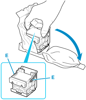Extraiga el nuevo cabezal de impresión de su bolsa sujetando los ganchos (E).