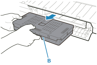 Tenez d'une main la cartouche d'entretien usagée par la poignée (B) et soutenez fermement la cartouche d'entretien de l'autre main par le dessous, en vous assurant qu'elle reste droite pendant que vous la retirez.