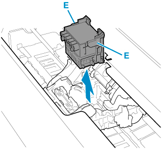 Saisissez les poignées (E), puis retirez la tête d'impression.