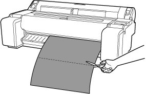 Tenendo fermo dal bordo inferiore il documento stampato per evitare che cada, selezionare Taglia carta (Cut paper) per tagliare la carta in rotolo.