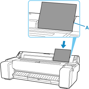 Caricare un singolo foglio con il lato di stampa rivolto verso l'alto nell'alimentatore manuale, con il bordo destro allineato con la linea allineamento carta (A) a destra del coperchio della carta in rotoli.
