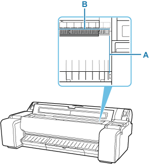 Caricare la carta mantenendo il bordo destro della carta allineato al prolungamento della linea allineamento carta (A) sul lato destro della stampante e la posizione di inizio stampa allineata alla scanalatura (B) sull'estremità più lontana del vassoio.