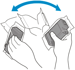 Prima di aprire il sacchetto, inclinare il serbatoio d'inchiostro a destra e a sinistra scuotendolo delicatamente una o due volte.